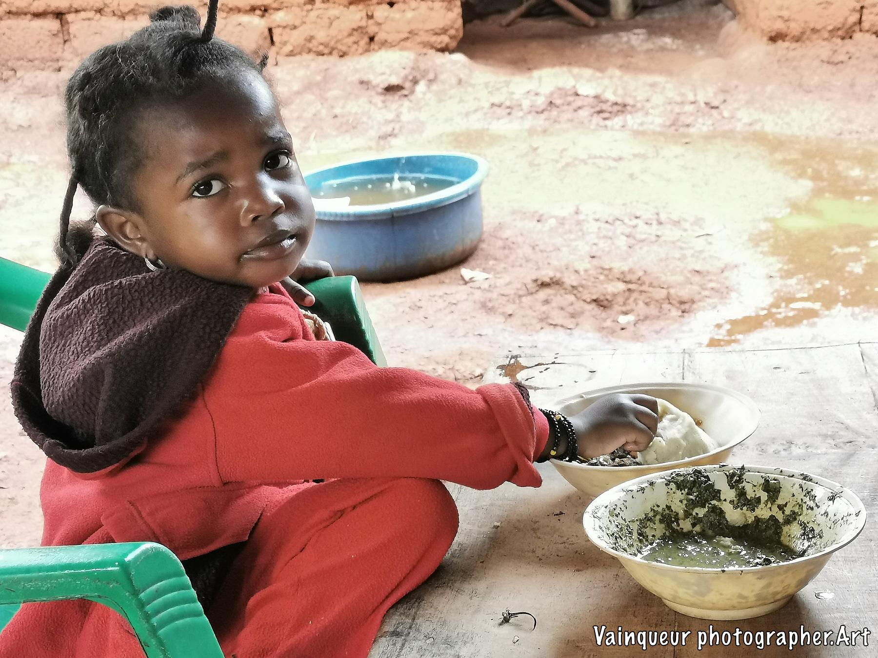 Little girl Aziza has dinner with little corn fufa and little fry with cassava leaf. While her older sister was eating, Aziza was sleeping and it was not possible to call her to the table to eat with her sister. They used to eat together, her mother explained to me that Aziza had no appetite when she eat at the table alone, but today Aziza eats with gusto.