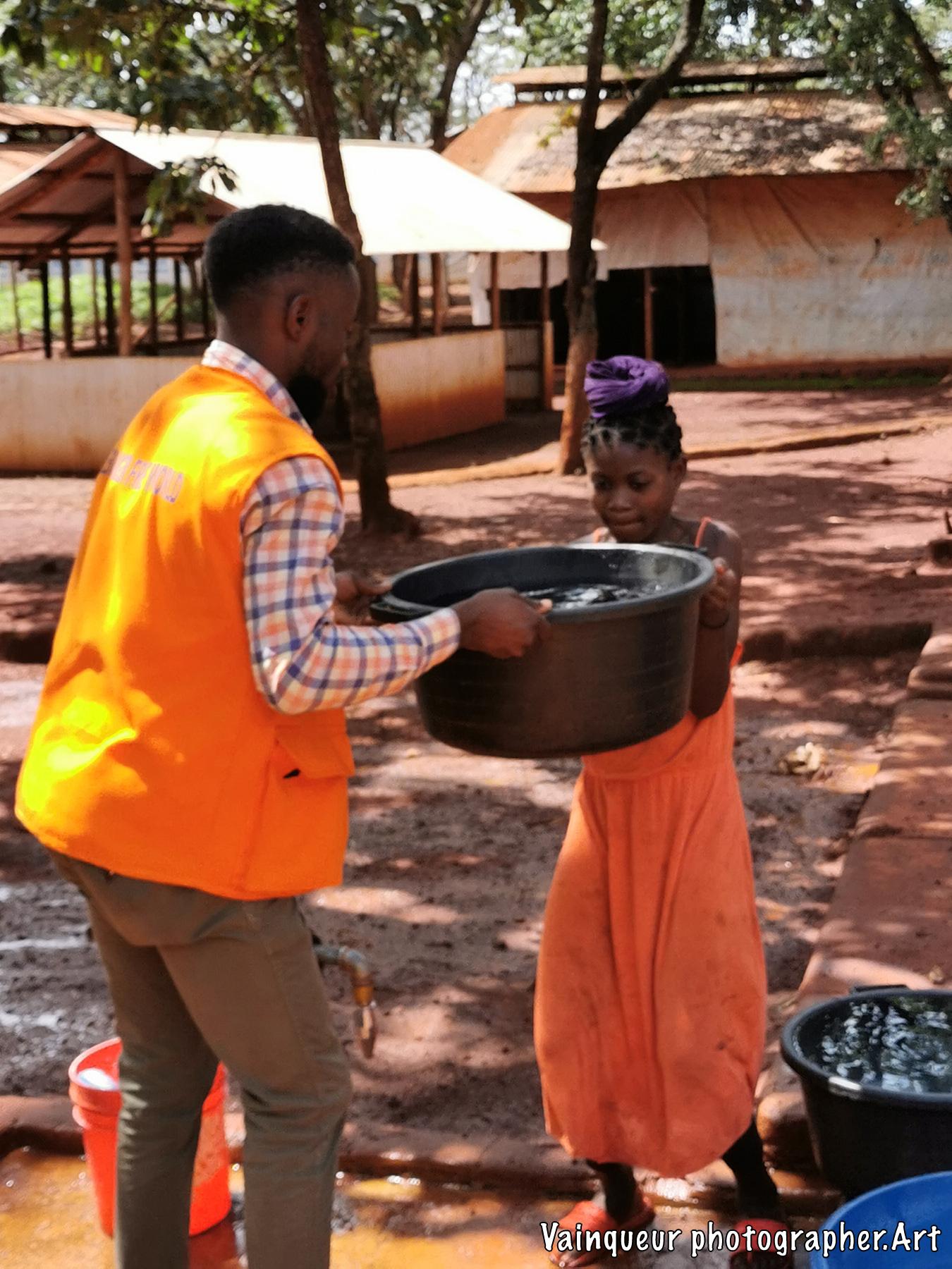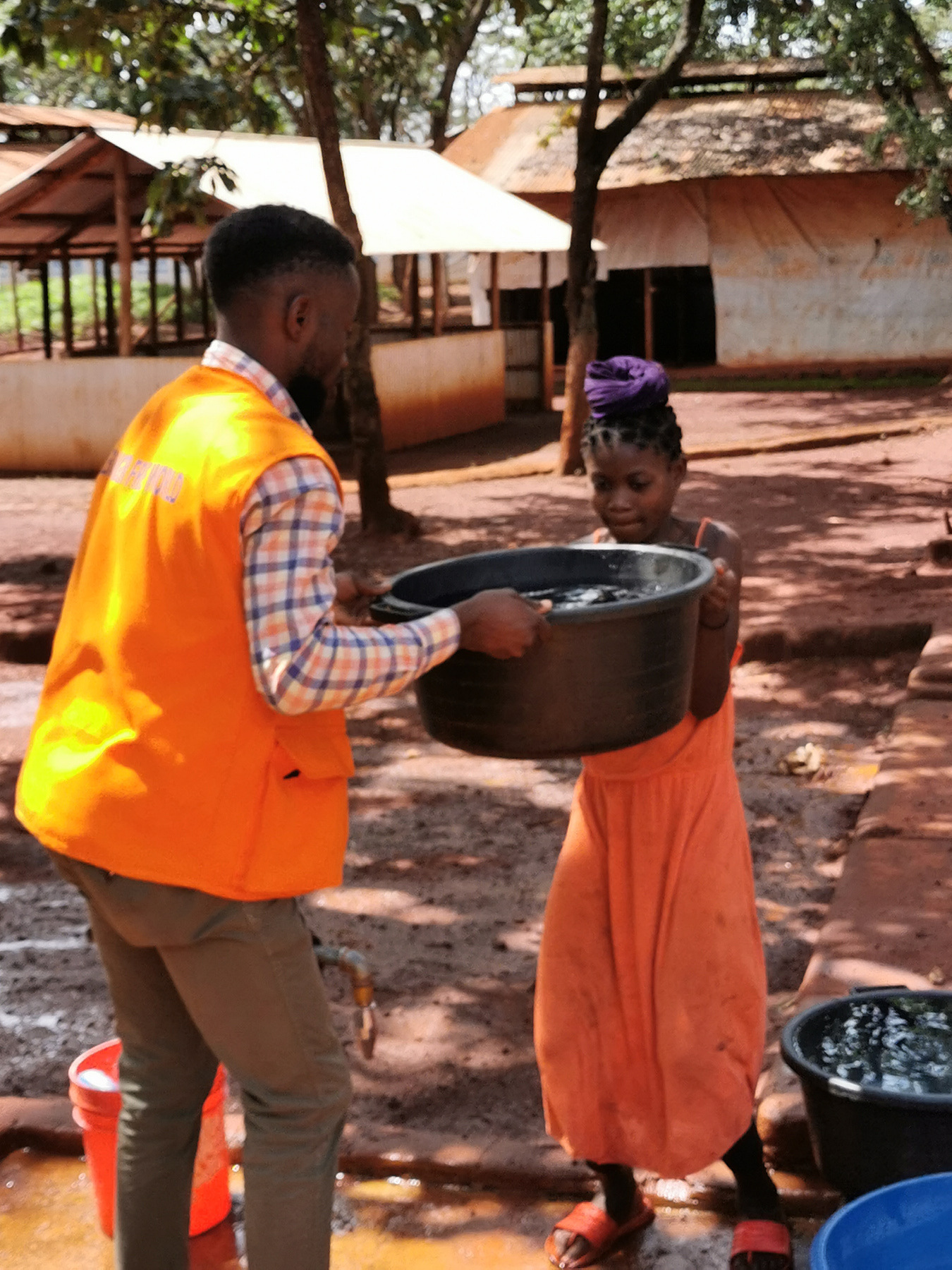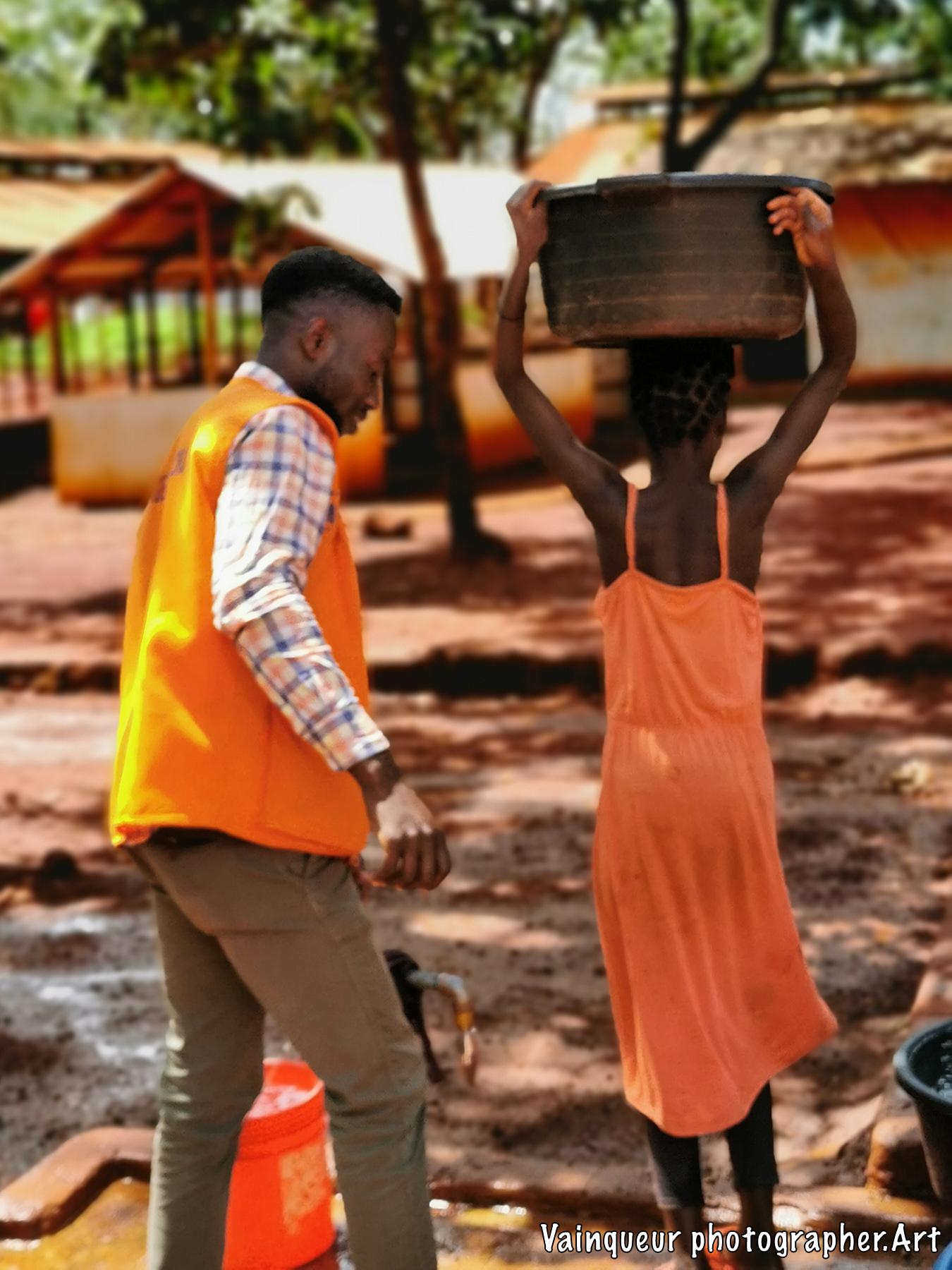 When my friend and I walked through the reception center to capture images and small stories of camp life, a girl pumping water called for help. She said: "S 'sam samahani kaka zangu na itaji msaada muni twishe." That means: "Excuse me, my brothers, I need your help to lift this pan."