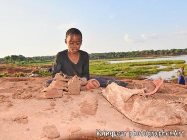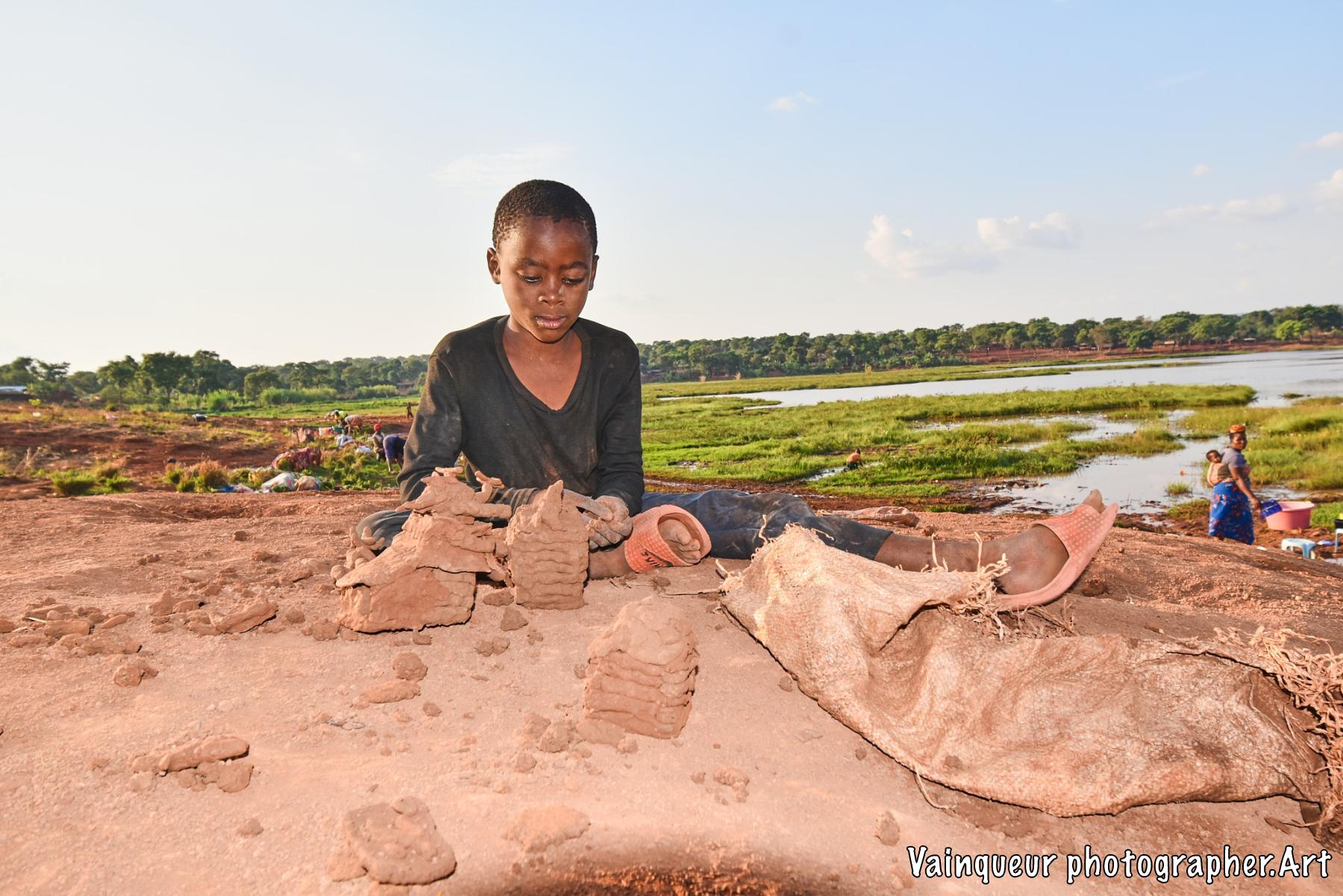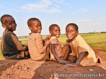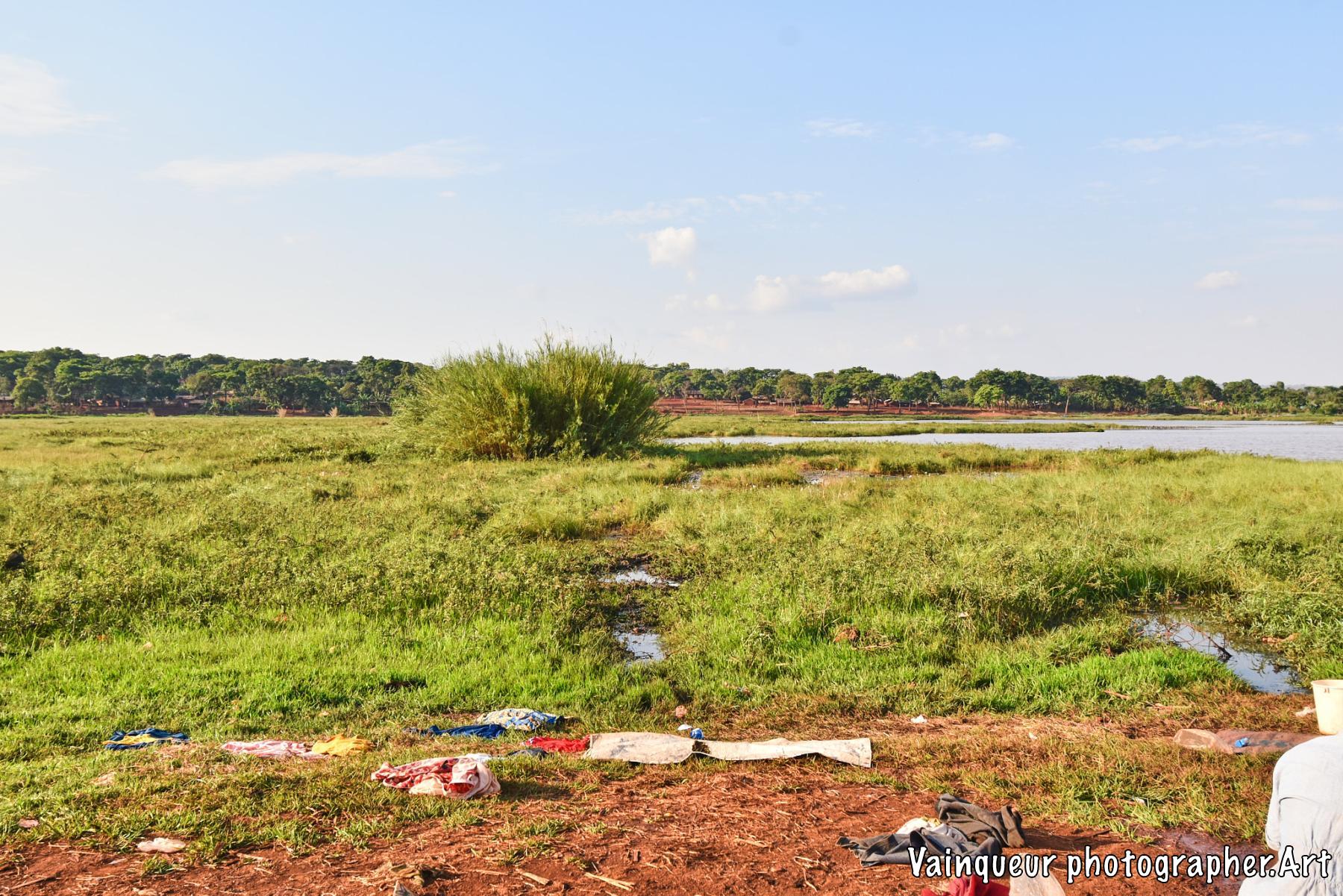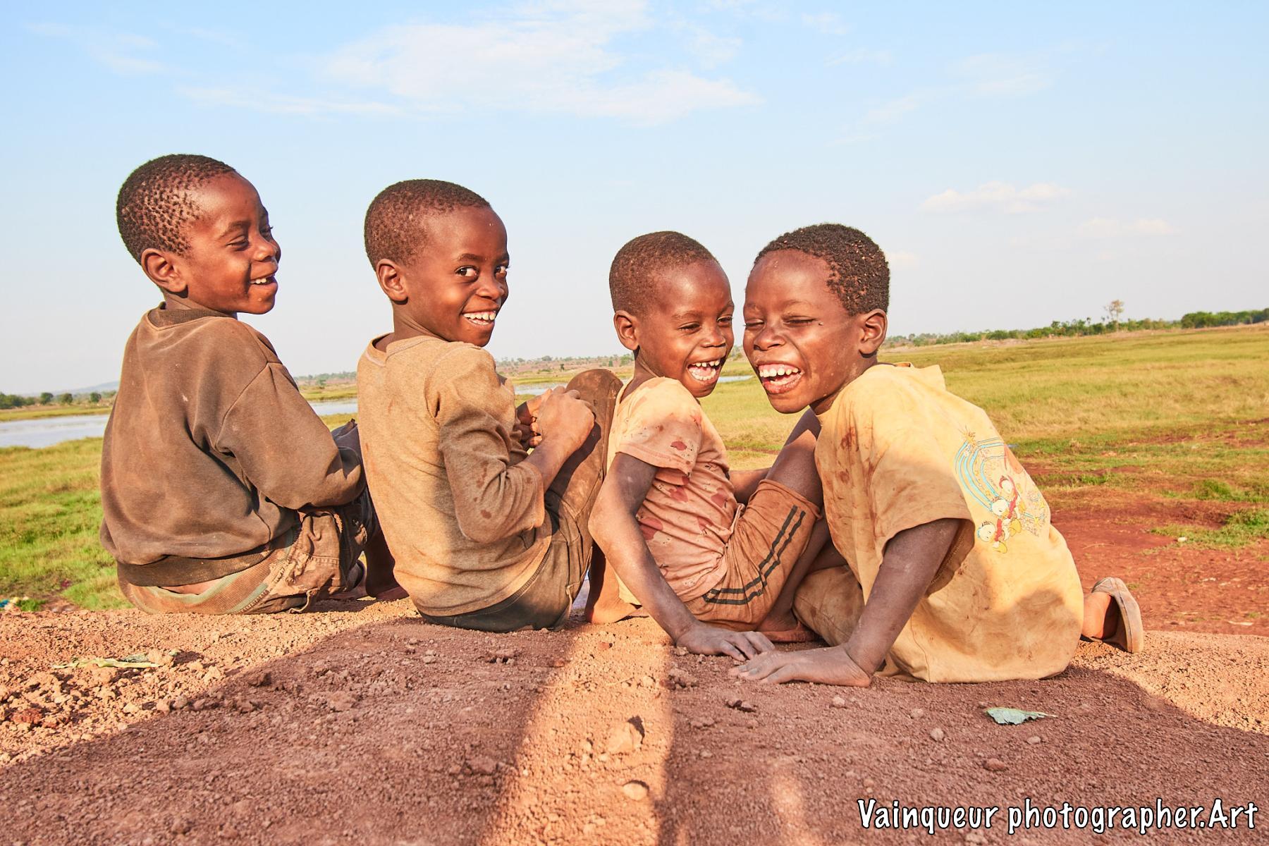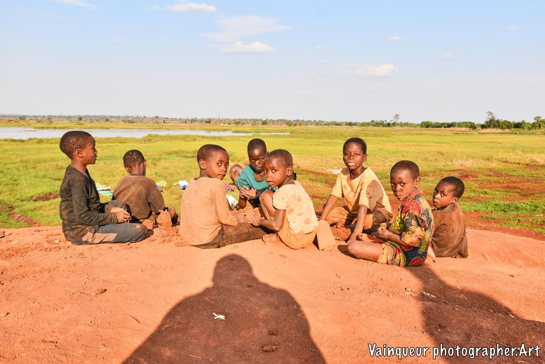Somewhere in the village of Nyarugusu children relax and enjoy the fresh air in the sunshine near a stagnant pool of water.
