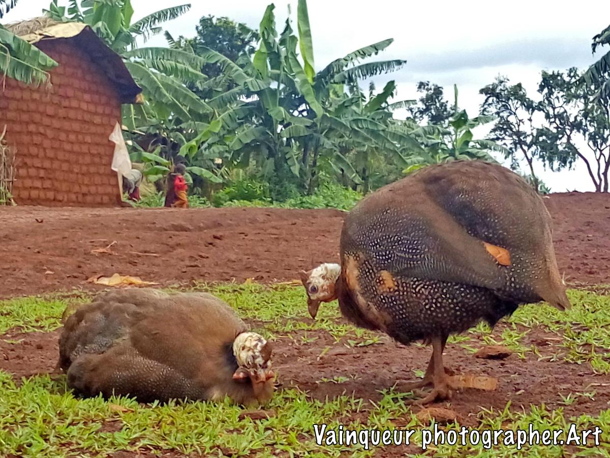 Some guinea fowls are found in zone 10 Nyarugusu camps in front of the house of a Burundian refugee. These guinea fowls feed on seeds as well as worms and ants.