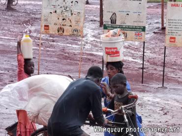 A heavy rain hit while we were in the machine of the food distribution centre. This little girl in photos came to receive the food and she worried about how to transport the bag of corn flour and other food during the rain destroying the path. It was impossible to transport on the bike. Several people are trying to transport the package by bicycle but it is not easy at all.