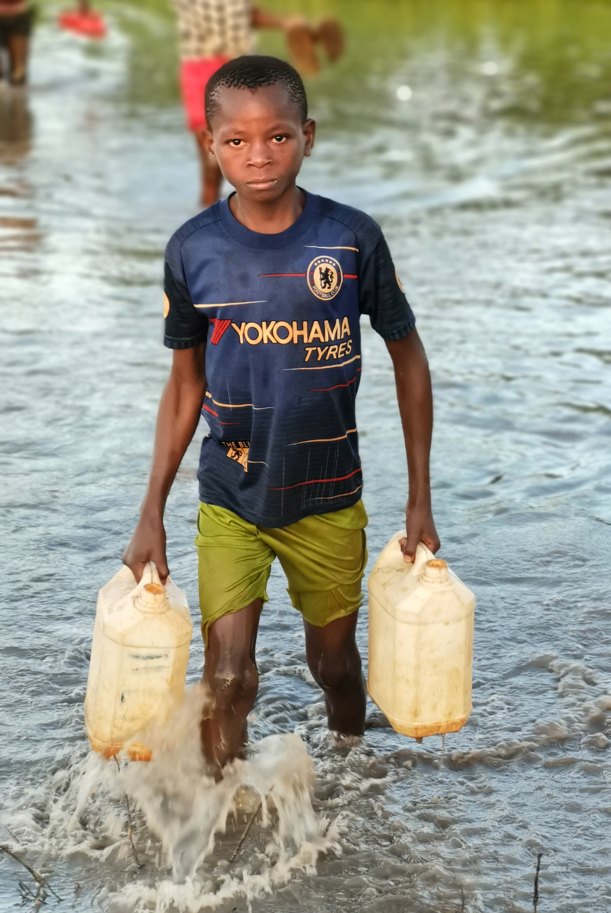 A Little Boy Crossing Stagnant Water To Get Water From Pump