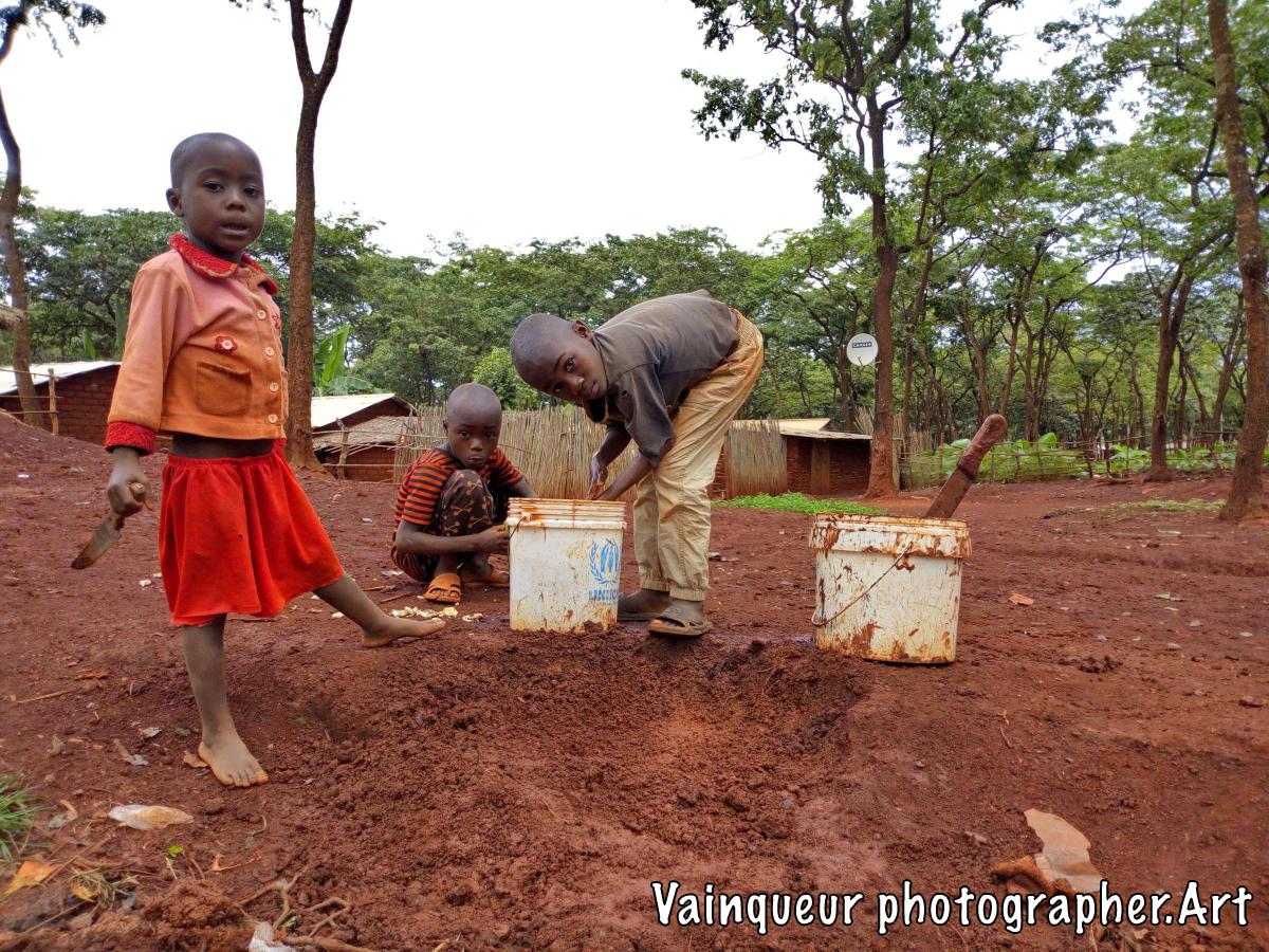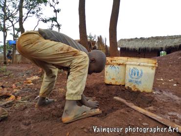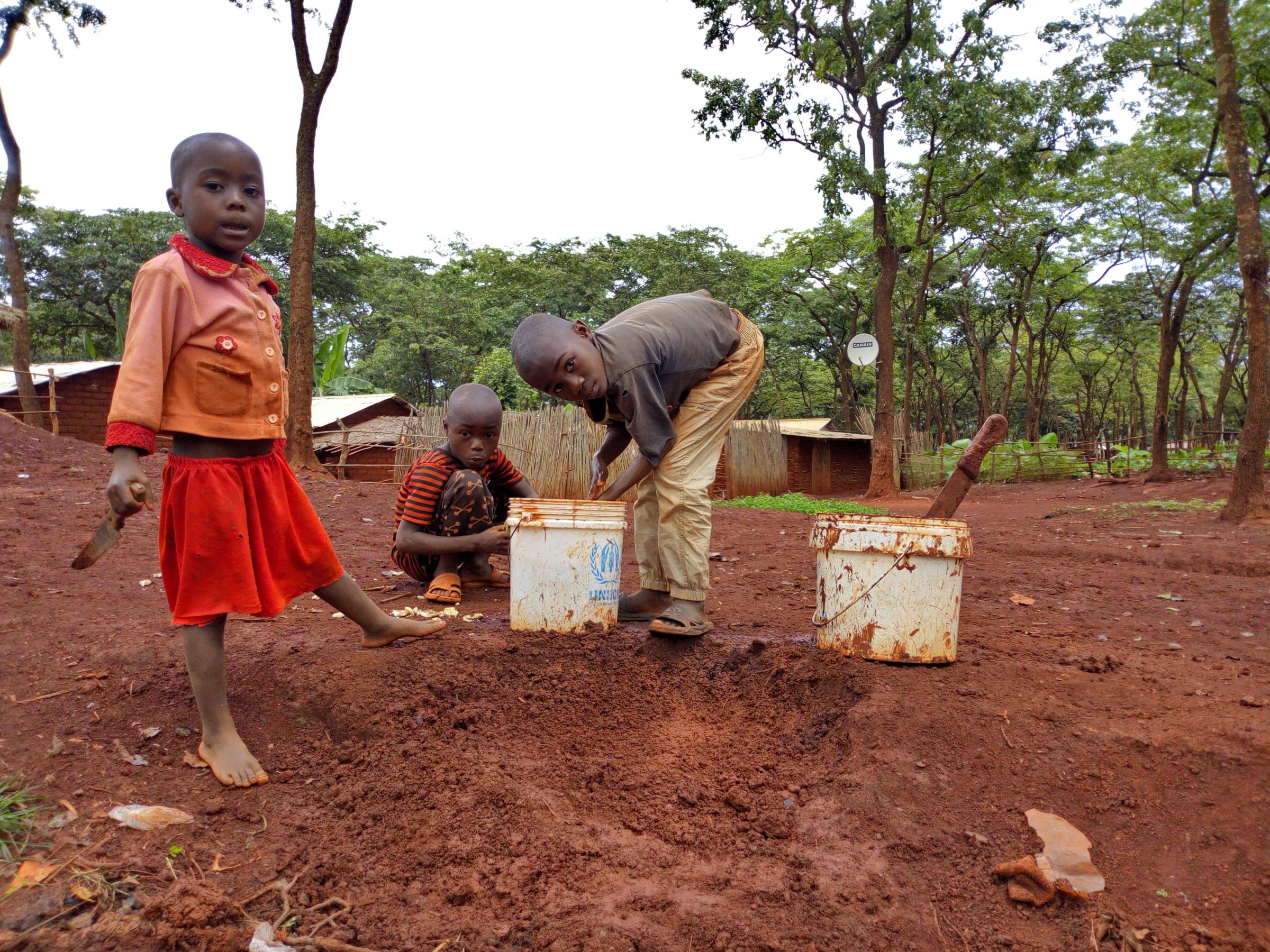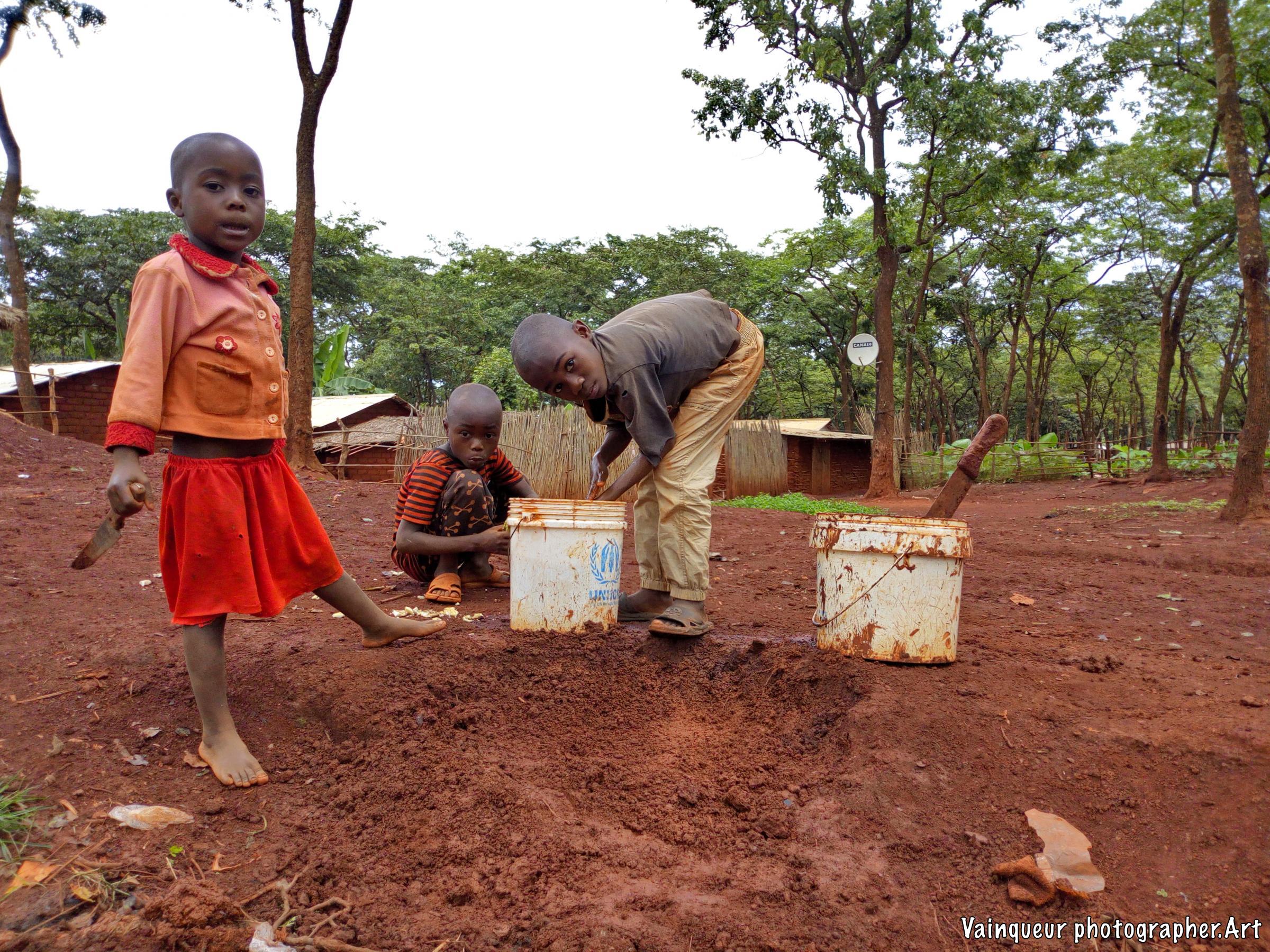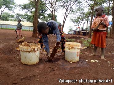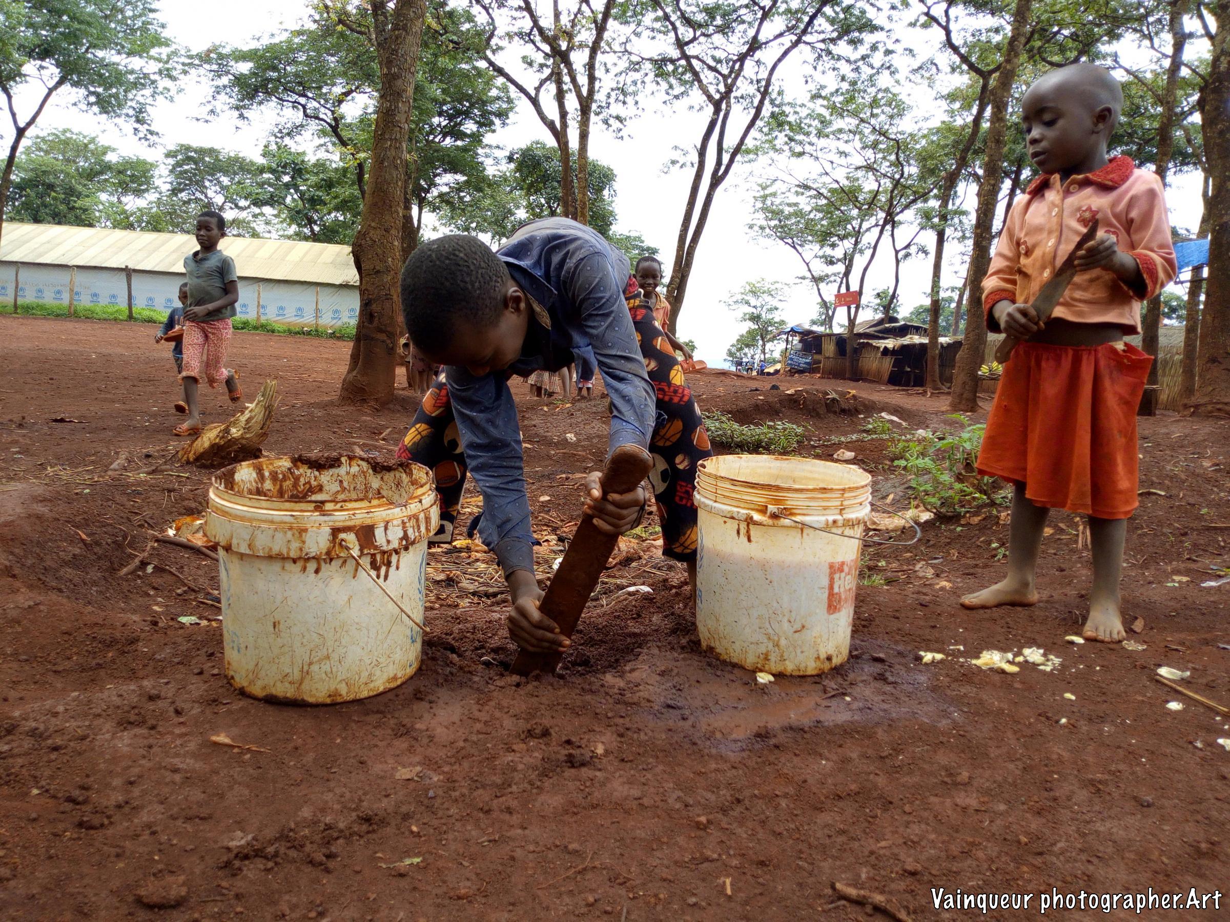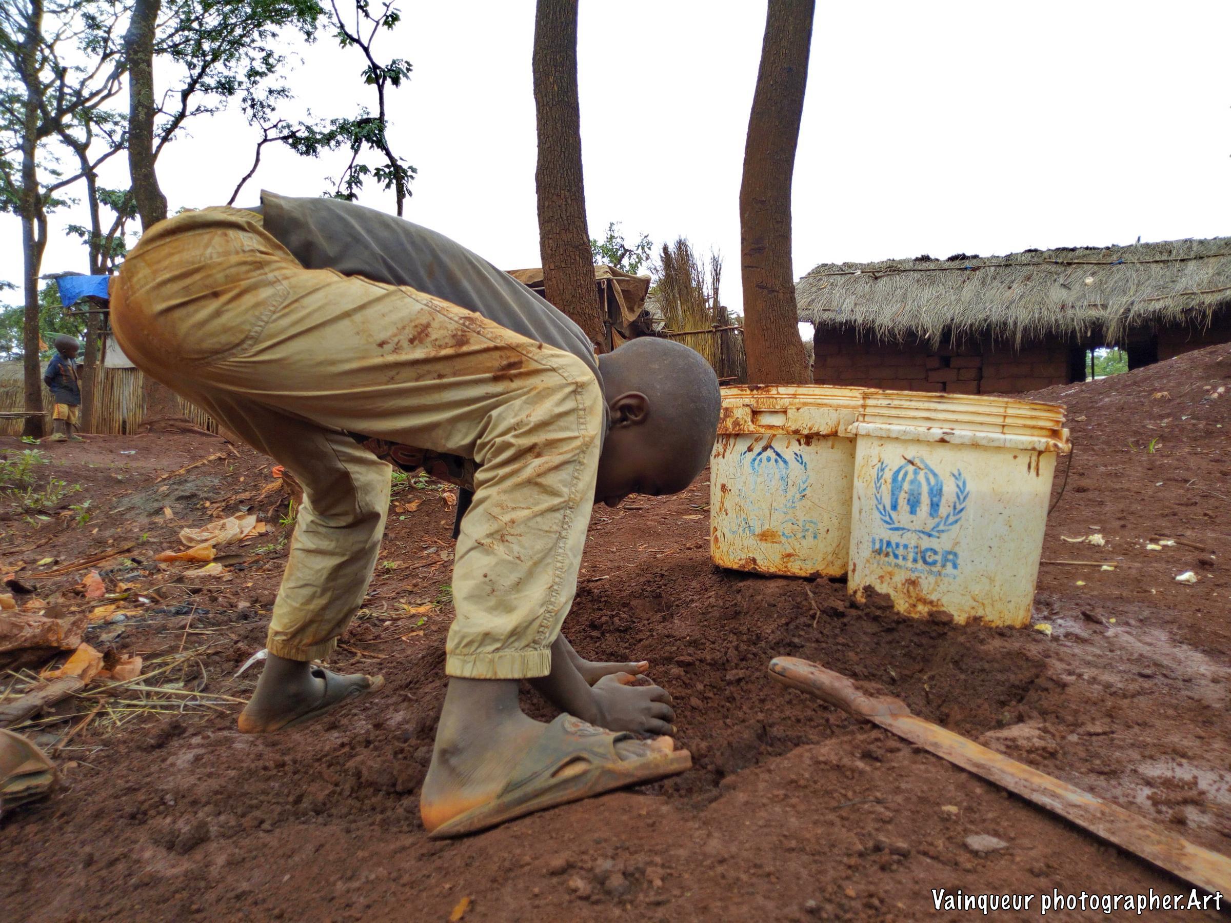 The little boy mixing the soil with water to build a part of their kitchen, that was destroyed in the recent rain.