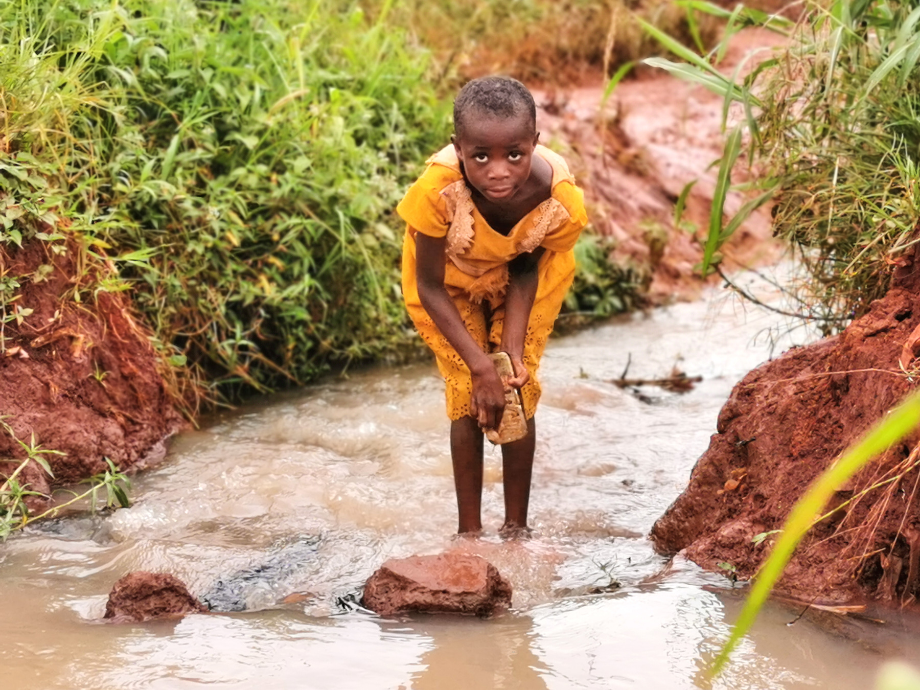 This little girl is a schoolgirl from Hodari Primary School located in Zone 1 village C1. The schoolgirls from this school, which live in Zone 14 and from the village VC, VA in Zone 6, make the shortcut crossing the small stream to arrive at their destination on time.