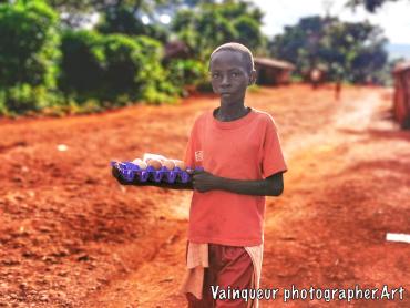 While the children are at home to respect the rule against the spread of viruses this child takes advantage of the time to sell eggs in the street of Nyarugusu. This boy sells an egg for 500 shillings, since the morning he goes around the camp with his goods. His small profit must help him to achieve his needs during this closure of the schools, he told me.