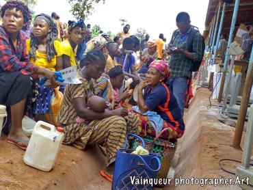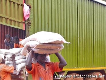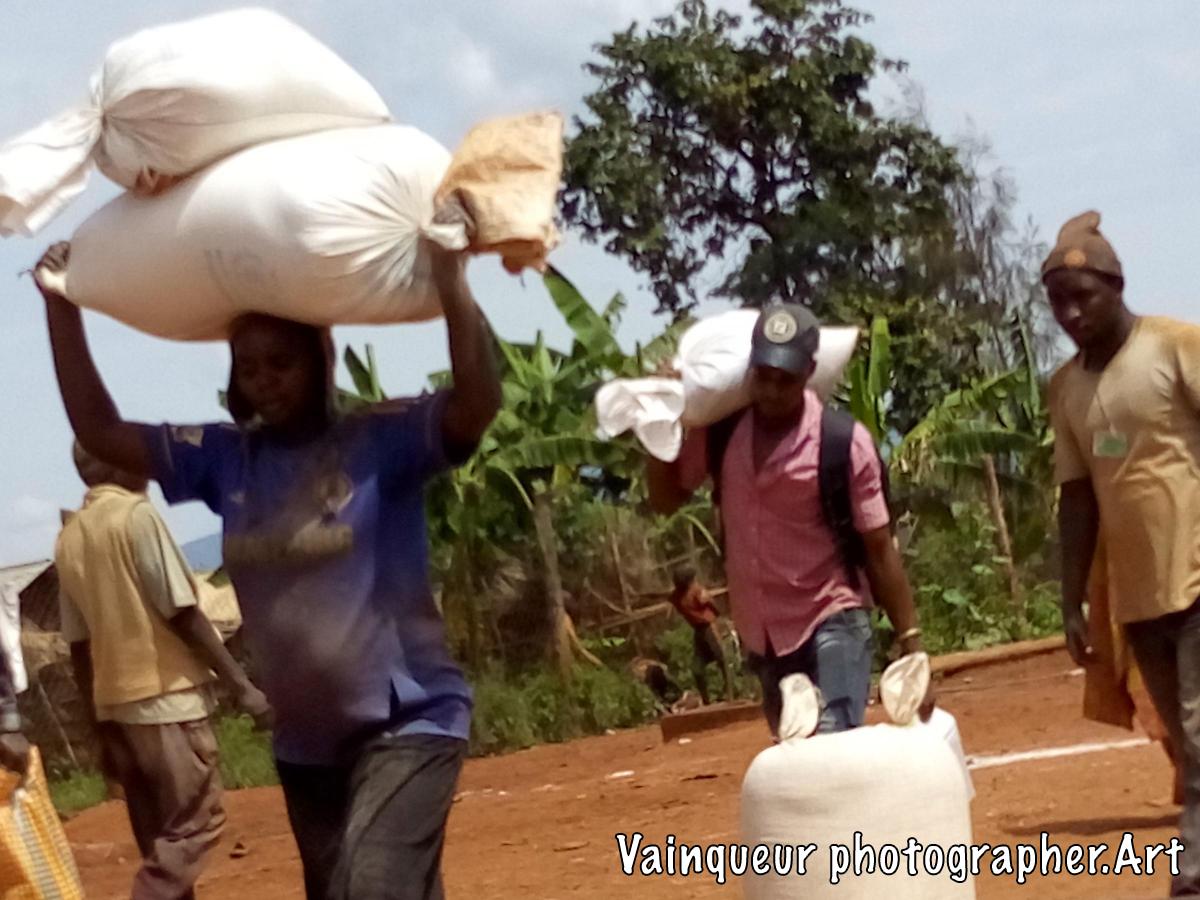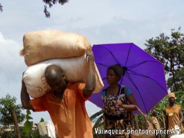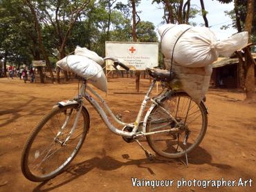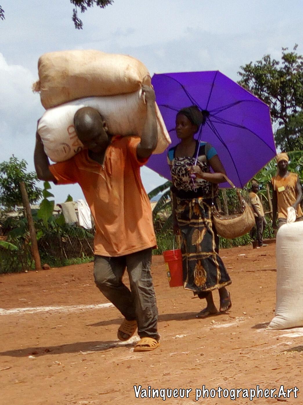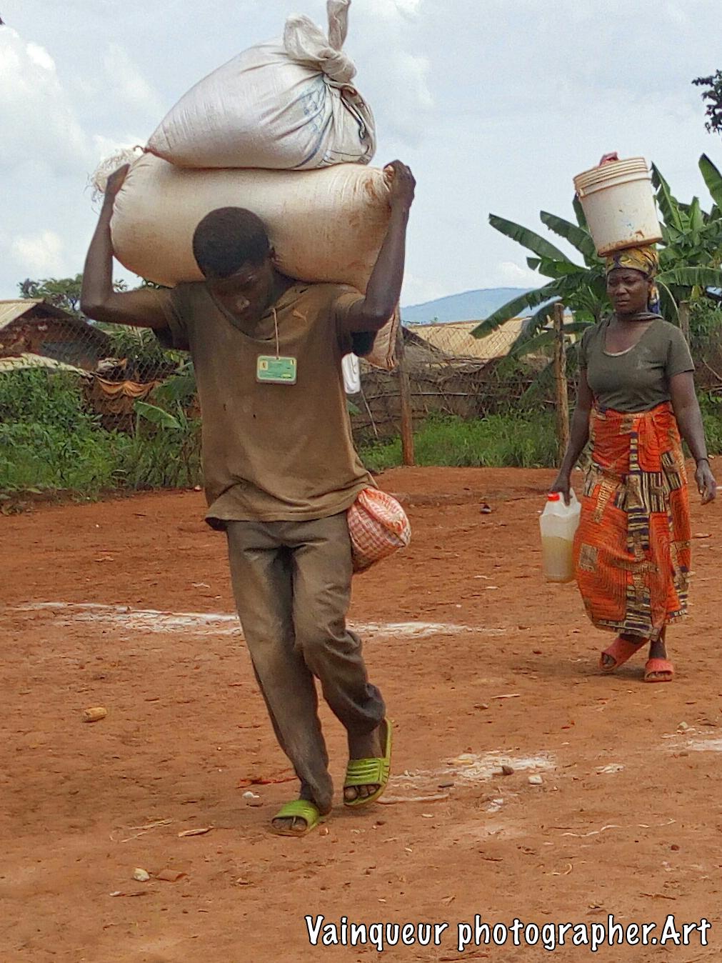 The refugees say (UNHCR ndo baba wetu) which means UNHCR is our father. Why do refugees want this? Here at the camps UNHCR is the father is a slogan is popular because UNHCR is the United Nations High Commission for Refugees. They're helping the refugees here at the camps and resettling to the country of the West. The refugees each month receive the food. They do not know where the food comes from but he discovers the logos in the bags like: USaid, WFP and others all this comes from the WFP (world food programm) repository with the UNHCR logos. The refugees do not try to understand where the food comes from but they say thank you UNHCR who are their father for taking care of them. On the distribution days each family is presented to the depot according to the criteria and to transport food to the home some use their physical strength and others the bikes to transport the parcels. We were surprised to see a man carrying the package in front and his wife is behind carrying the baby on.