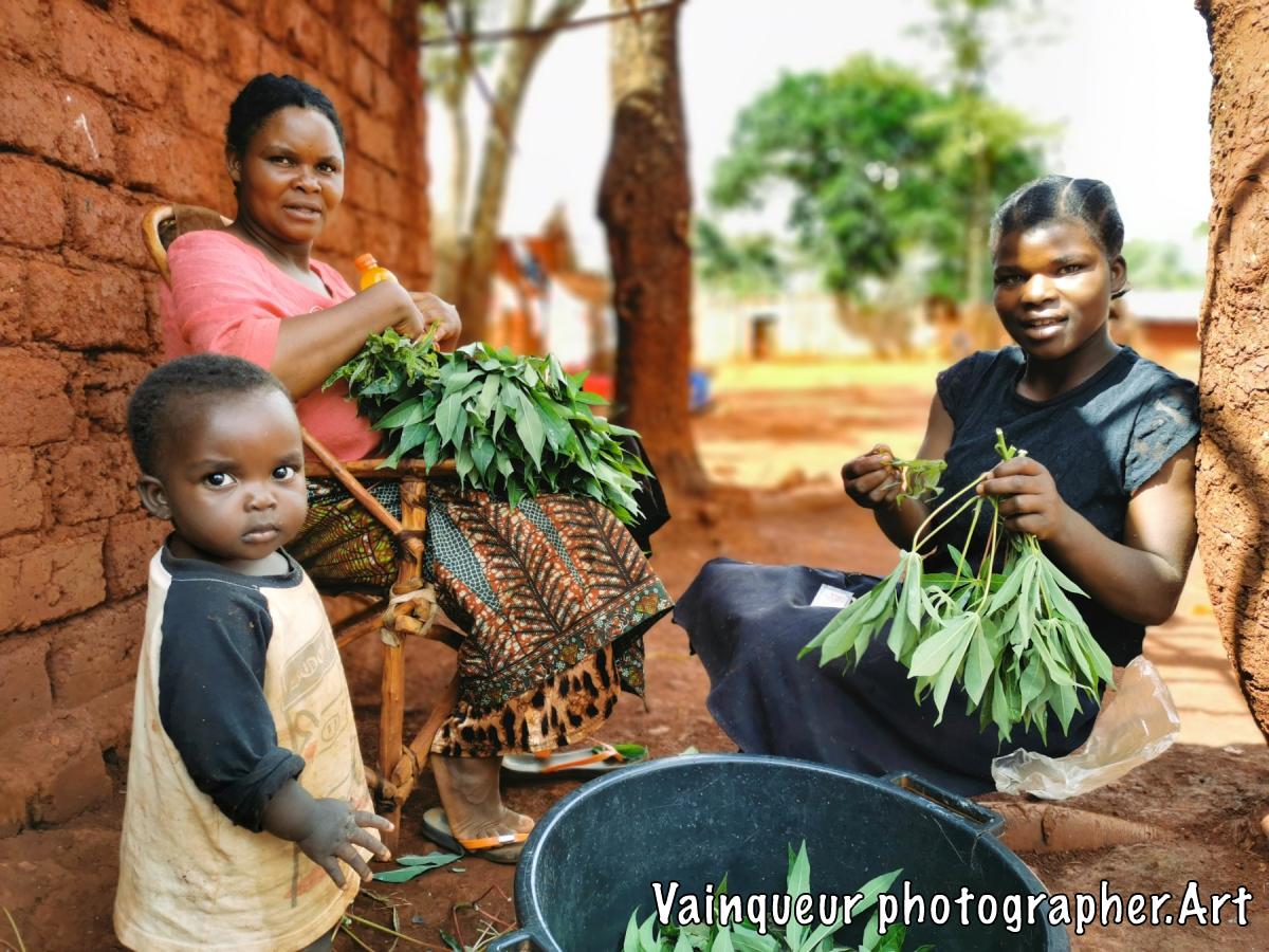 This woman and her daughter prepare the leaves of the cassava plants for their afternoon and evening meals after having drunk the mixture of salt for lack of sugar.