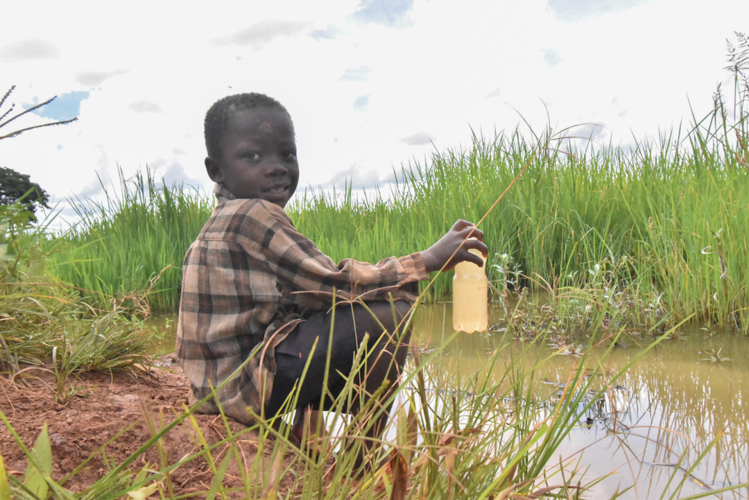 After a recent rainfall, a young boy approaches a small water point at the edge of tall grass.