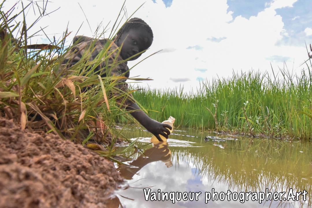 Upon arrival, he finds the water contaminated with waste, including plastic bottles. Without hesitation, he begins removing the debris from the surface. In a thoughtful gesture, he then fills a bottle with the water to bring back as evidence of its condition.