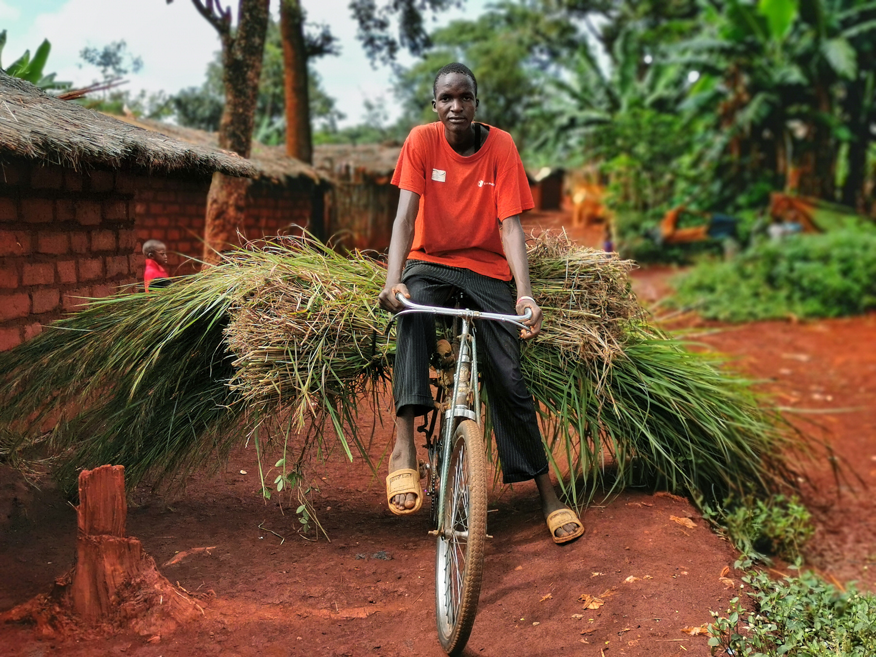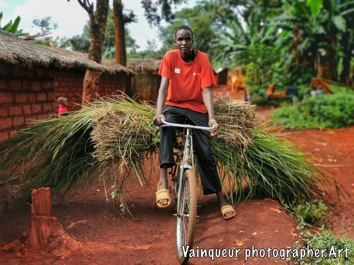 The person in this photo told me that nyasi grows far from Nyarusugu and he needs at least a means of transport. He needs a large amount of nyasi to cover his house, which no longer has any nyasi leafs, only a tent. He concluded that those who wear nyasi on their heads are strong and courageous, even if they lose energy unnecessarily because it is a long way.